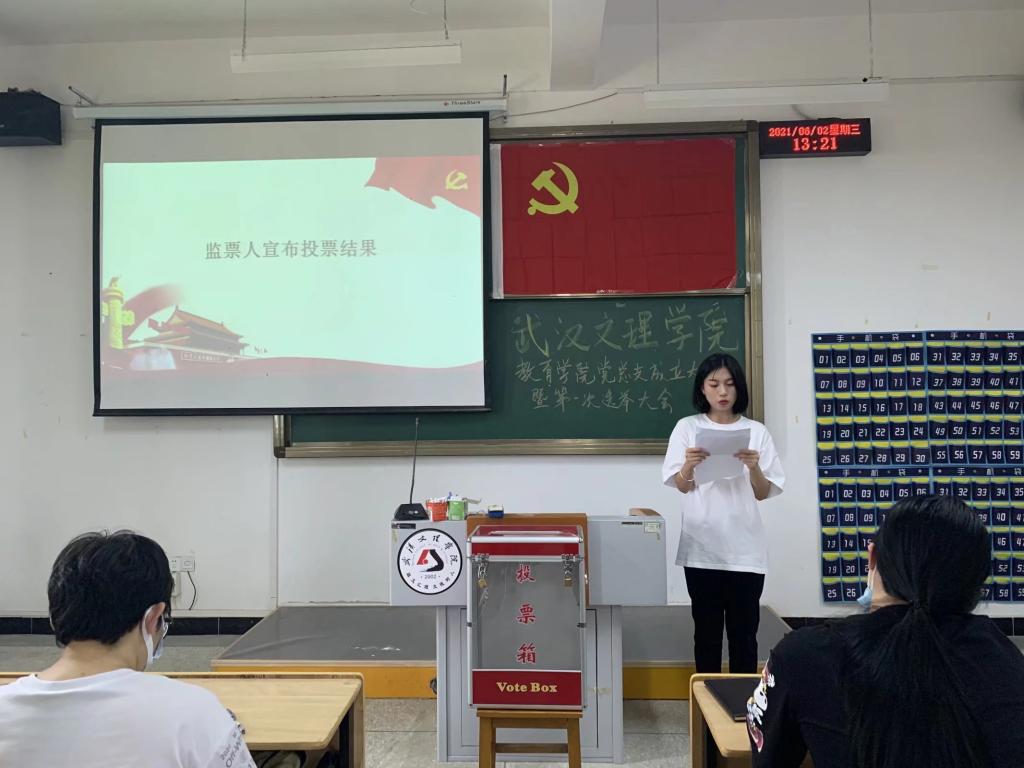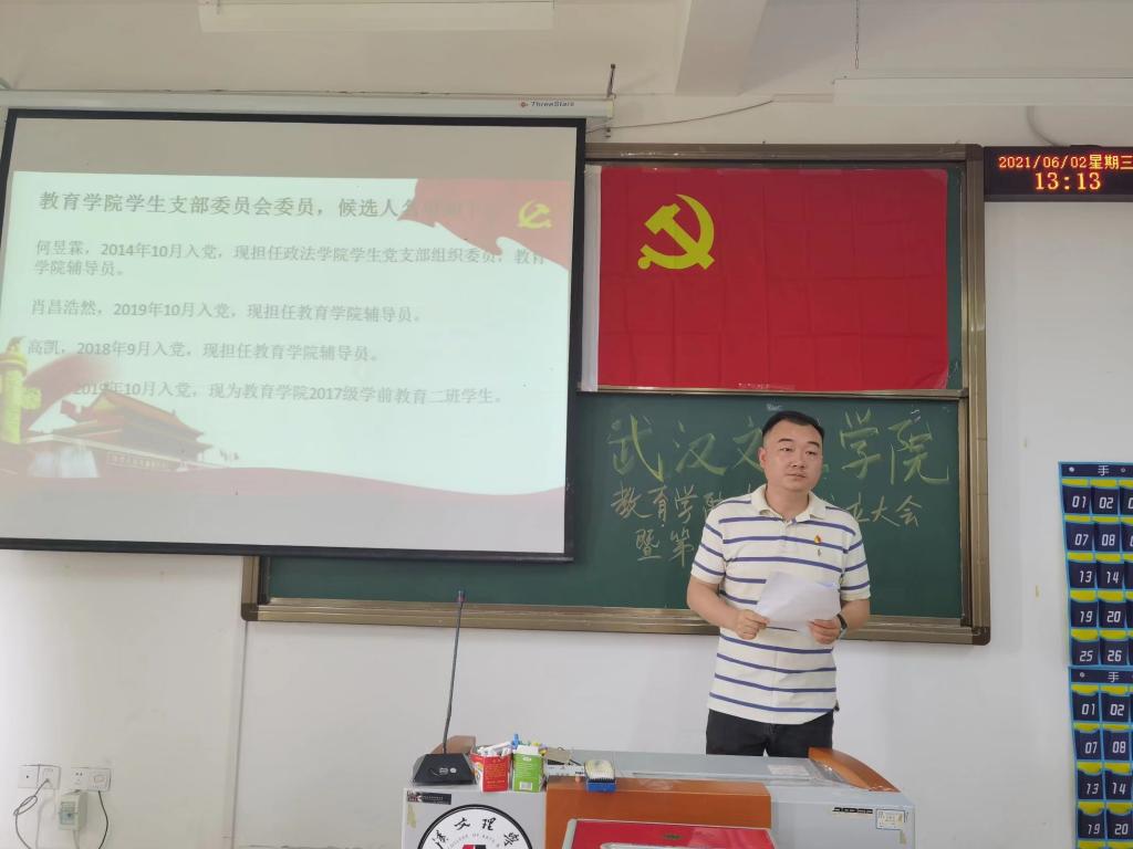 会议在雄壮的国歌声中开幕,刘超同志给全体党员宣读了武文理党〔2021〕5号《关于同意成立williamhill英国威廉希尔教育公司党总支部的批复》文件。在大会选举环节,经介绍候选人预备人选简历后,根据党章规定,全体党员按照民主、公正、透明的原则,采取无记名投票方式和差额选举办法,选举williamhill英国威廉希尔教育公司党总支委员会委员、williamhill英国威廉希尔教职工党支部委员会委员、williamhill英国威廉希尔员工党支部委员会委员。