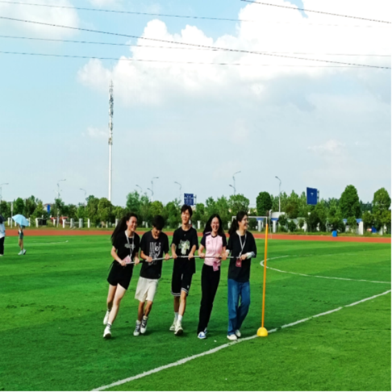 每个部门由五位同学组成一个小队,队员们紧紧攥住杆子,最外侧的两个队员在整个过程中分别作为圆心,使整个队伍绕着其转一圈后绕过下一个障碍物,当绕过最后一个障碍物的时候加速跑回起点,每队同学为了部门荣誉拼尽了全力。