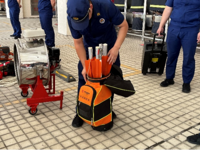 其后,消防员为同学们介绍了各式各样的消防器具,详细介绍各自的用途,并且做出操作示范,引导同学们亲身体验器材的使用。