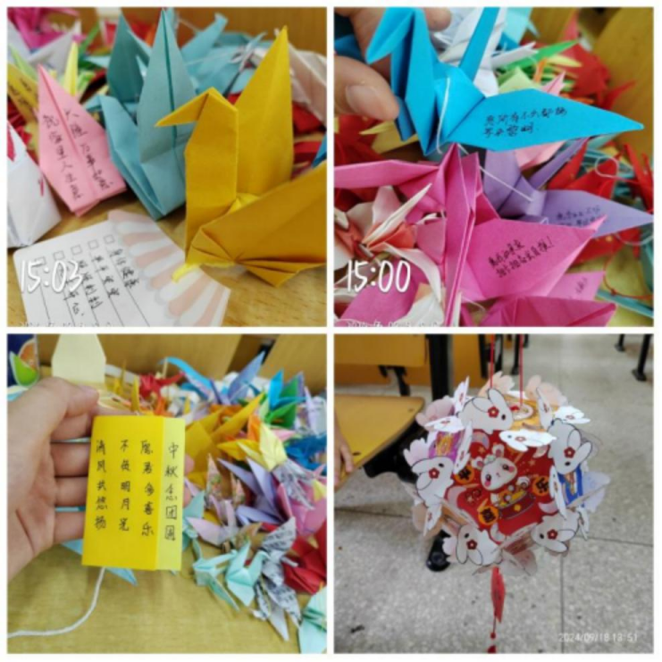 活动如火如荼的进行着,千言万语,比不过此时的一个个千纸鹤,同学们通过千纸鹤来传达思念,体会中秋之美、团圆之意。