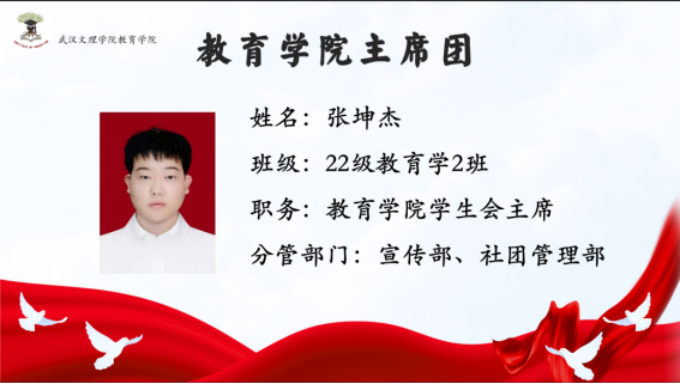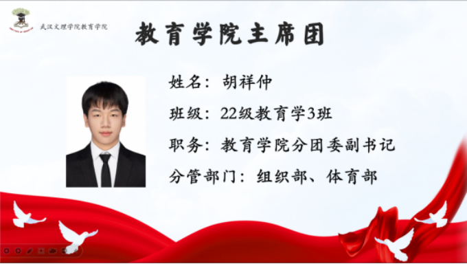 首先由主持人介绍与会的五位主席团成员:williamhill英国威廉希尔分团委副书记陈沪坤学长分管秘书部、志愿者工作部;williamhill英国威廉希尔分团委副书记胡祥仲学长分管组织部、体育部;williamhill英国威廉希尔员工会主席张东旭学姐分管外勤部、文艺部;williamhill英国威廉希尔员工会主席周婷婷学姐分管员工部、青年发展部;williamhill英国威廉希尔员工会主席张坤杰学长分管宣传部、社团管理部。