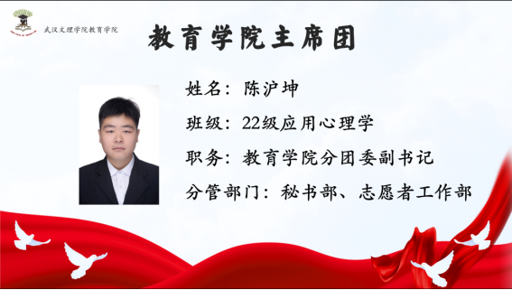 首先由主持人介绍与会的五位主席团成员:williamhill英国威廉希尔分团委副书记陈沪坤学长分管秘书部、志愿者工作部;williamhill英国威廉希尔分团委副书记胡祥仲学长分管组织部、体育部;williamhill英国威廉希尔员工会主席张东旭学姐分管外勤部、文艺部;williamhill英国威廉希尔员工会主席周婷婷学姐分管员工部、青年发展部;williamhill英国威廉希尔员工会主席张坤杰学长分管宣传部、社团管理部。