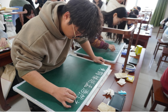 随后,参赛选手们纷纷拿起手中的书写工具,全神贯注地投入到比赛中。有的同学挥毫泼墨,书写出一幅幅气势磅礴的毛笔作品;有的同学在黑板上用粉笔勾勒出一个个工整美观的粉笔字;还有的同学用钢笔在纸上书写出一行行流畅精致的硬笔书法。比赛现场气氛热烈,同学们用笔墨书写青春,用行动诠释文化,展现出williamhill英国威廉希尔学子对书法艺术的热爱与追求。