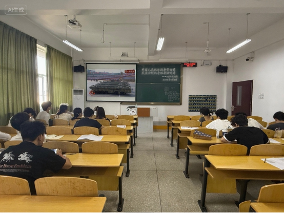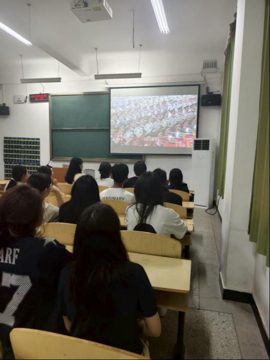 全院员工以班级为单位观看阅兵式。屏幕前,无数双年轻的眼睛专注而明亮,看着受阅部队方阵整齐划一地排列着等待检阅。跟随镜头的转换,阅兵式中向我们展示了太空、战略支援、网络空间信息等领域的新型武器装备,这些新式武器装备彰显了我国的国防科技与工业实力正朝着智能化、信息化方向发展。