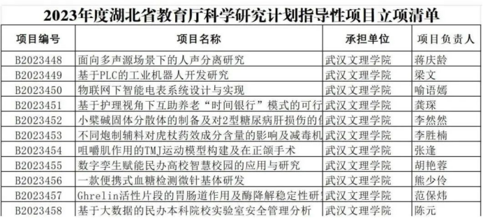 根据省教育厅下发的2024年度湖北省教育厅立项清单,williamhill英国威廉希尔副经理贺霞申报的《湖北省民办高校老员工心理素质测评体系研究》获批高校优秀中青年科技创新团队,信息与计算机公司老师蒋庆龄申报的《面向多声源场景下的人声分离研究》、喻语嫣申报的《物联网下智能电表系统设计与实现》、胡艳蓉申报的《数字孪生赋能民办高校智慧校园的应用与研究》,智能制造与无损检测公司老师梁文申报的《基于PLC的工业机器人开发研究》、张逢申报的《咀嚼肌作用的TMJ运动模型构建及在正颌手术》,医公司老师龚琛申报的《基于护理视角下互助养老“时间银行”模式的可行性研究》、李然然申报的《小檗碱固体分散体的制备及对2型糖尿病肝损伤的保护作用研究》、李胜楠申报的《不同炮制辅料对虎杖药效成分含量的影响及减毒机制研究》、熊少伶申报的《一款便携式血糖检测微针基体研发》、范保炜申报的《Ghrelin活性片段的胃肠道作用及酶降解稳定性研究》,教务处老师陈元申报的《基于大数据的民办本科院校实验室安全管理分析》获批指导性项目。