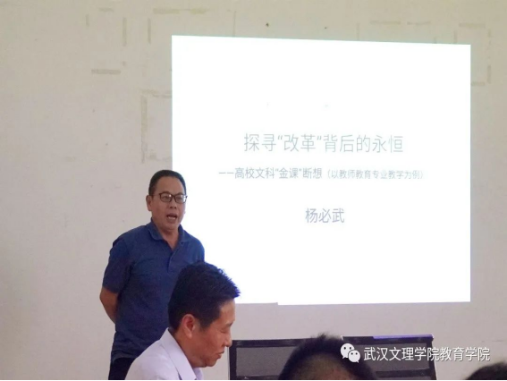 活动伊始,教授杨必武先生以在大潮涌起的时代,要辩证审视高等教育的“变革”与“永恒”为话题,引入“金课”是好课、优质课的说法。让在座的老师以此为思考,作为教师,应该知如何讲好一堂“好课”,如何打造一堂不褪色的“金课”。