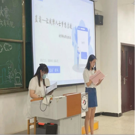 在院赛中,比赛分为PPT展示、现场答辩两个环节。选手们两两搭配,娓娓道来,从团队项目的创办的宗旨、项目内涵、项目价值以及实践成果等方面进行讲解。评委老师秉承公平公正的态度,从项目可行性、现实意义、社会价值等多方面进行考量。