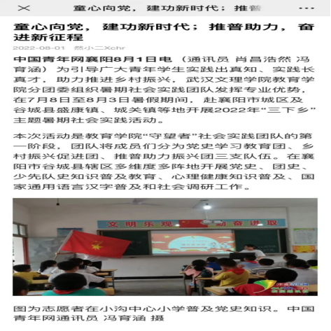 在本次活动开展过程中,公司暑期社会实践团队获得中国青年网(团中央主办)、人民号(人民日报主办)、今日头条、腾讯网、搜狐网、长江云(湖北广播电视台)等多家媒体以及襄阳市委宣传部、襄阳市文明办、谷城团县委等政府部门关注,并被多平台宣传展播。